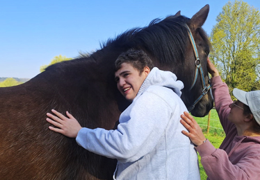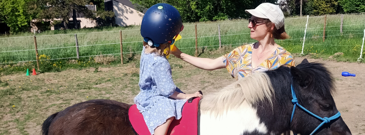 Établir du lien avec le poney, prendre soin de lui, de soi. Ainsi se développent les premières rencontres empruntes de jeux et de câlins, dans un climat familial.